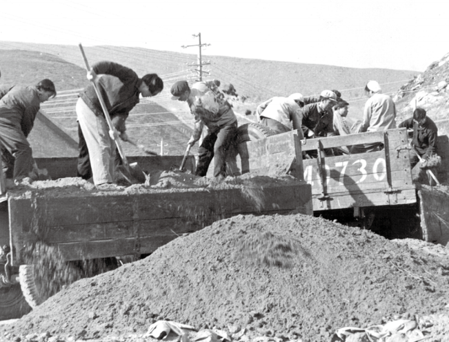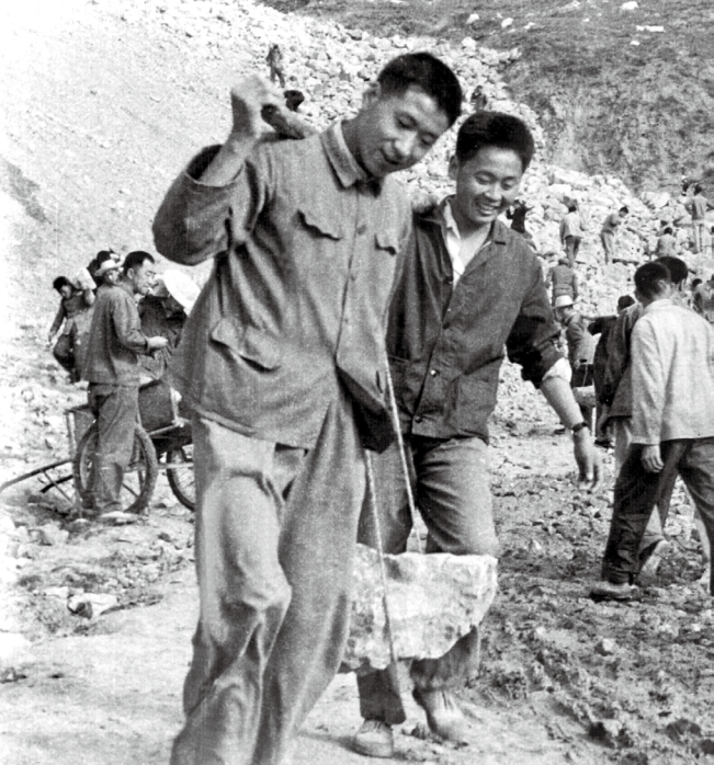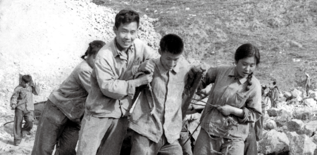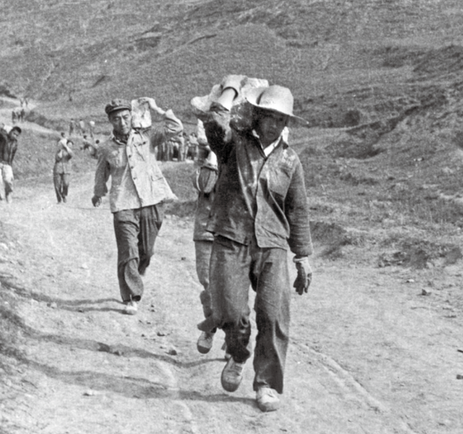 1970年冬,建設(shè)者們身背肩扛,將石頭運往工地